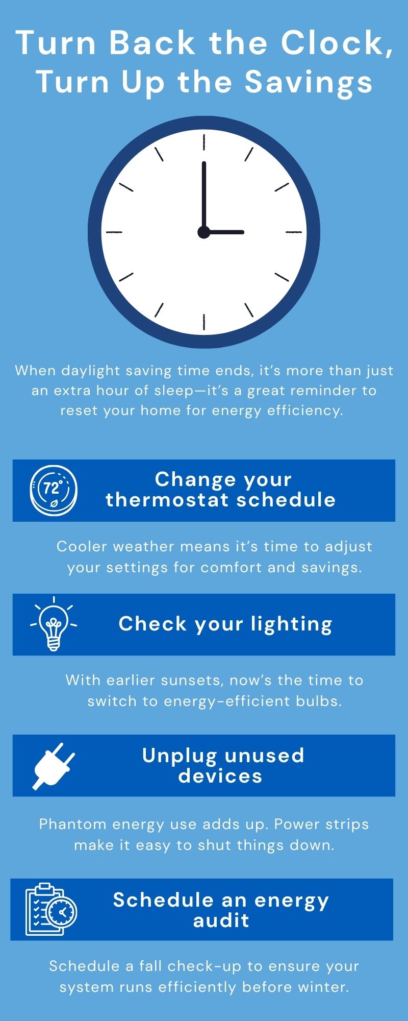 Daylight saving time is ending, but your energy savings are just getting started. A few quick changes around the house can make a big difference. Fall back into smarter habits with these tips.